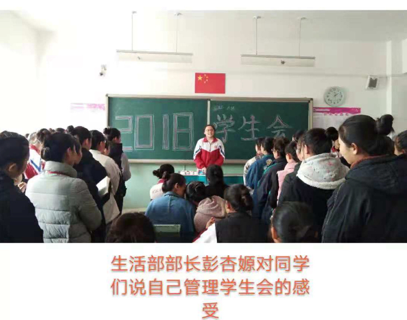 活动现场,三年级的同学们首先嘱咐学妹们要认真工作,多为学生会做贡献!接下来一二年级的同学们为学姐们表演节目,表达了依依惜别之情。卫生部全体同学合唱的《房间》娓娓动听,婉转悠扬。生活部表演的 《东西 》扣人心弦,惟妙惟肖。礼仪部集体合唱 《可不可以》甜如津蜜,清澈动听。体育部、文宣部合唱的 《再见》优美的歌声在教室里缓缓回荡,别有忧愁暗恨生 此时无声胜有声。纪律部集体合唱的《请先说你好》让人陶醉在优美的音乐旋律里……最后,上一届学生会主席宣布了下一届学生会各部门的负责人名单,新一届学生会即日起开始履职。