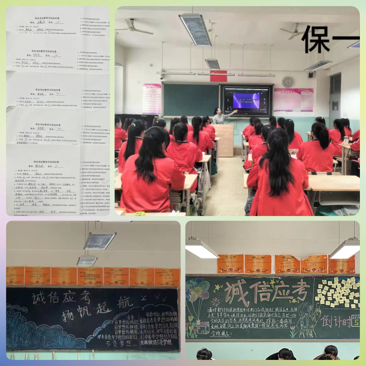 按照学校制定的《考风考纪教育月活动方案》,学校还利用宣传栏、电子大屏、条幅等进行宣传。教务处还组织三年级各班召开了“诚信应考,从我做起”的主题班会,参加了以“以诚信应考”为主题的板报评比和手抄报评比活动,同时还组织学生填写了考风考纪月活动问卷,给全体三年级家长发放了《致家长的一封信》。多种渠道、多种形式宣传,让每名考生对考风考纪教育内容入心、入脑。